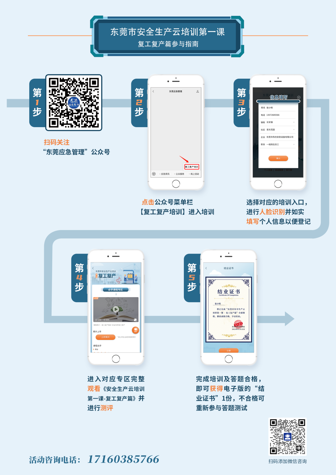 參與指南:關(guān)注“東莞應(yīng)急管理”公眾號,通過點(diǎn)擊公眾號菜單欄【線上活動→復(fù)工復(fù)產(chǎn)培訓(xùn)】,登記個(gè)人信息,完成注冊后,點(diǎn)擊“我要參加”進(jìn)入培訓(xùn)內(nèi)容界面,點(diǎn)擊觀看視頻進(jìn)行學(xué)習(xí)。
